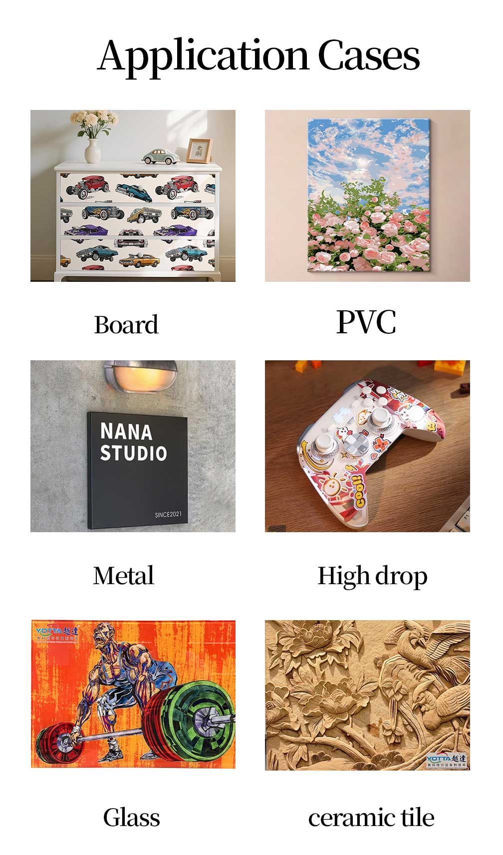 Glass, acrylic, wood, ceramic, metal board, PVC, plastic, corrugated board, leather, EVA, Cylinder,etc.