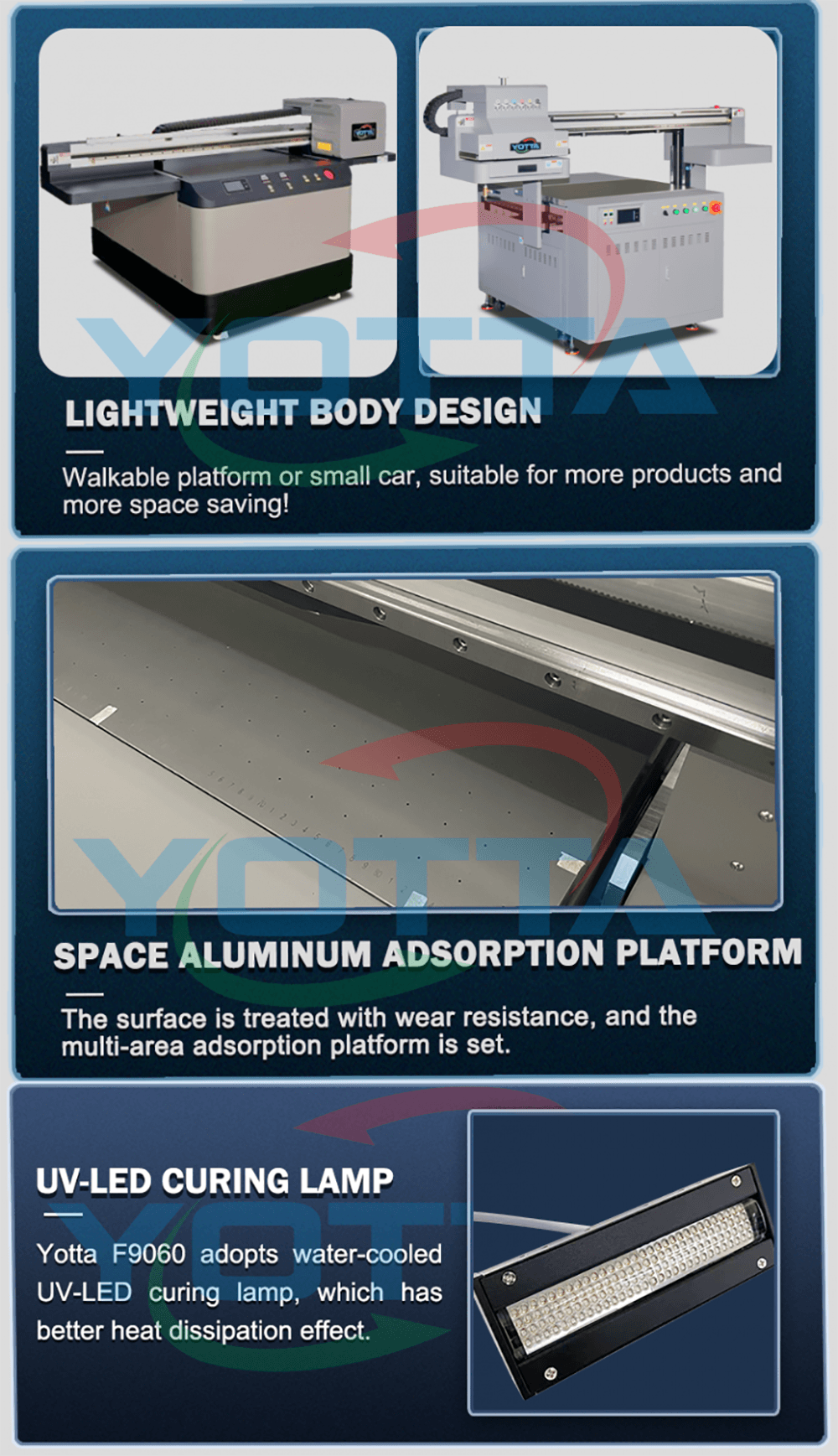 Adopting new 1-4 pcs grey level G5i internal heating industrial micro piezo print head, YOTTA YD-F9060G5i small format UV flatbed printer present bright full-color printing on its 90cm×60mm bed. It is featured with 3.5pl droplet printing, able to print high quality lifelike images with less ink consumption. With excellent print performance, it is a cost-effective solution for items with small size, such as phone cases, crafts, signs, wall panels, cylinders,etc, especially suitable for personalized printing business.
