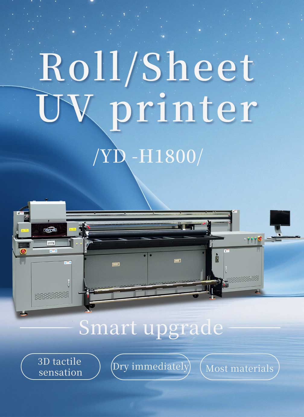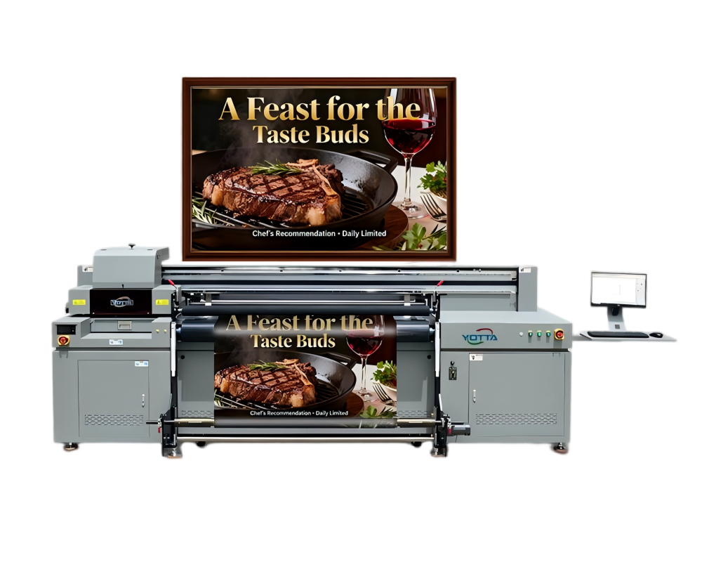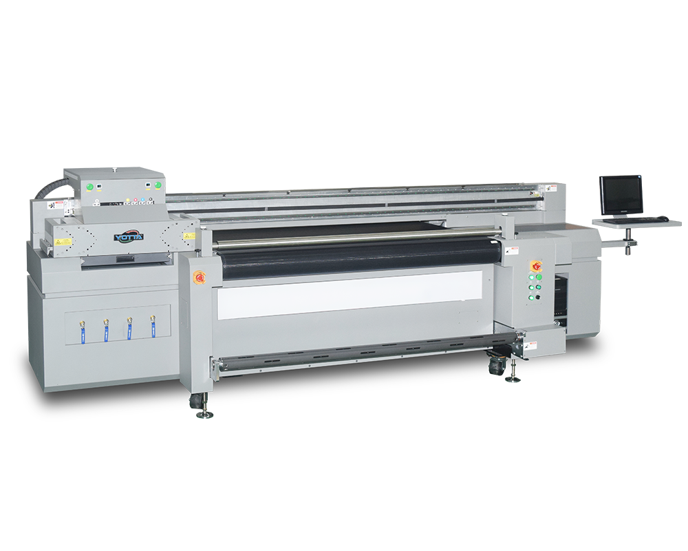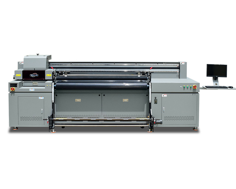 A combination of uv flatbed and roll to roll printer, print rigid and flexible media with fast speed.