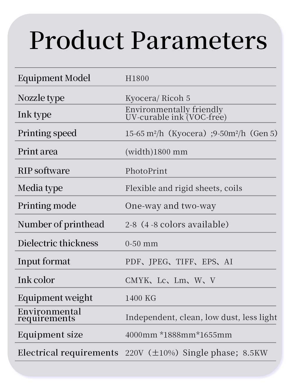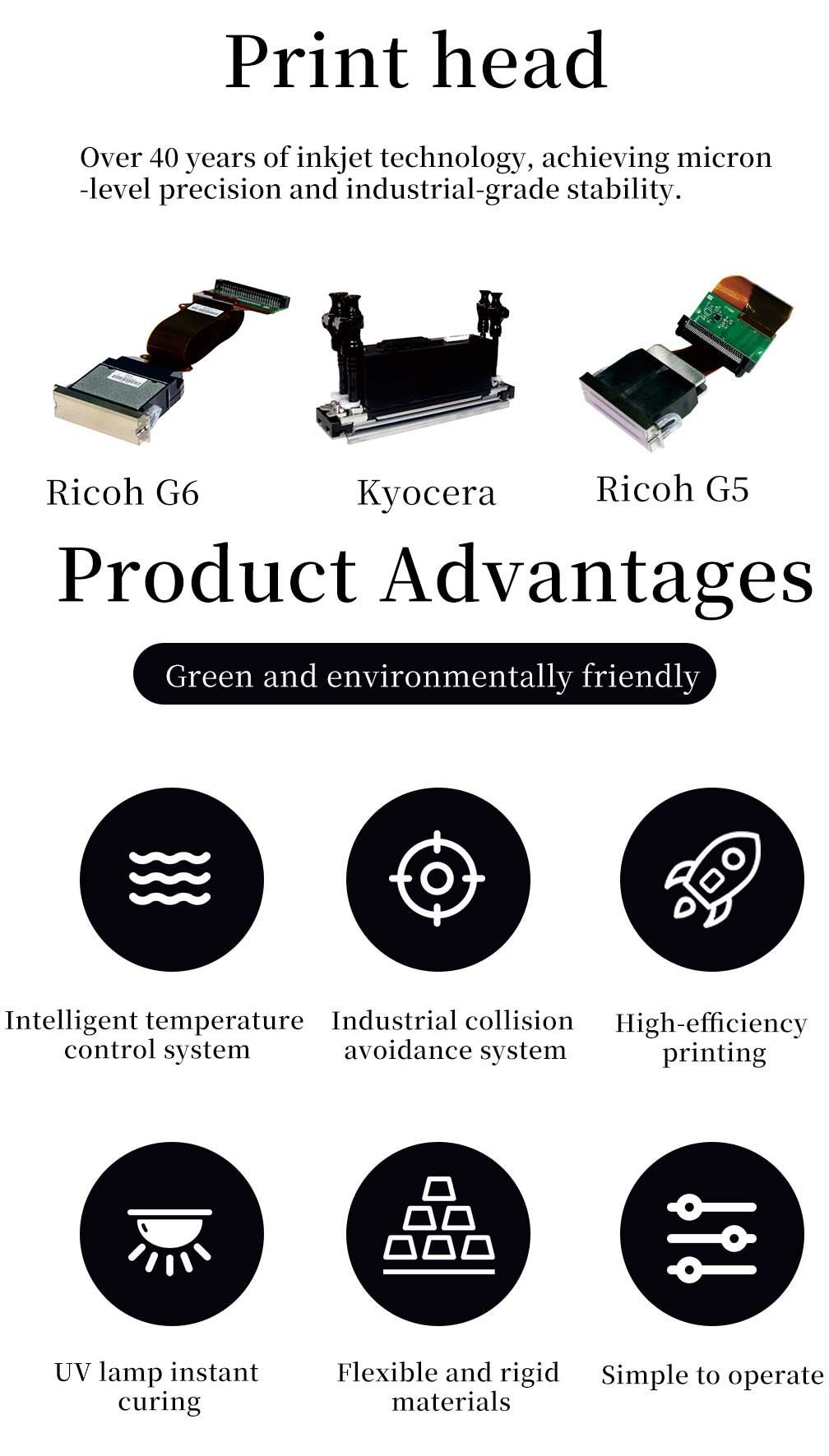 Two kind of printheads optional: Ricoh Gen5/GEN6 or Kyocera KJ4A printhead.