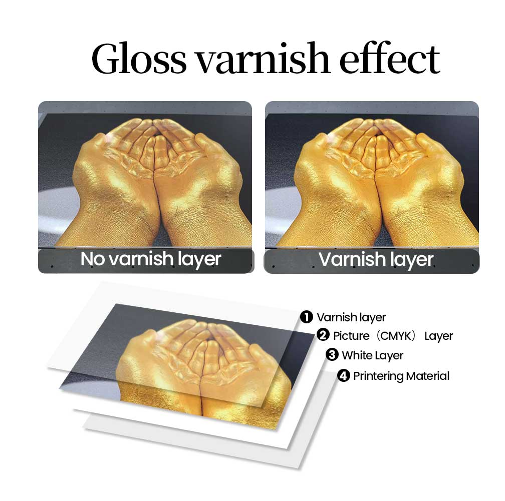 Eco-friendly UV ink and full-color printing: CMYK+ LcLm, white ink or Varnish.