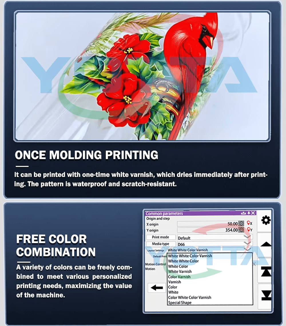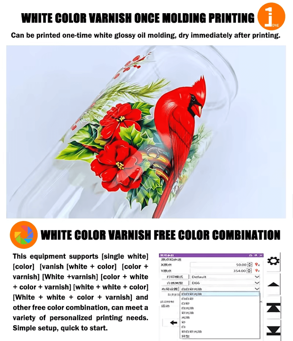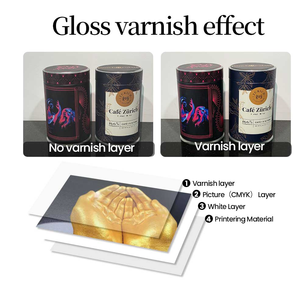 Print CMYK, white ink and varnish (optional).